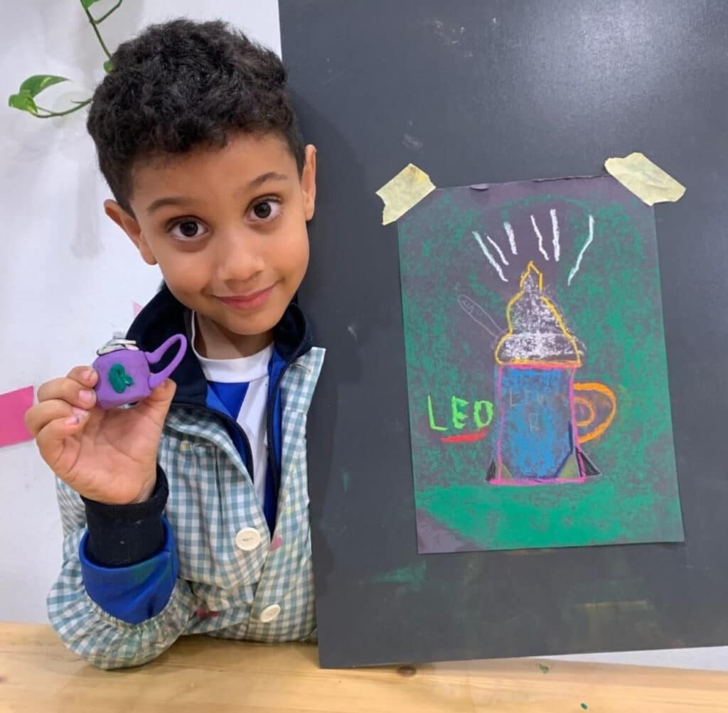 A esta edad, trabajamos en ejercicios que refuercen su motricidad y coordinación mano-ojo, como dibujar formas simples y mezclar colores. También fomentamos la imaginación a través de proyectos creativos y guiados.