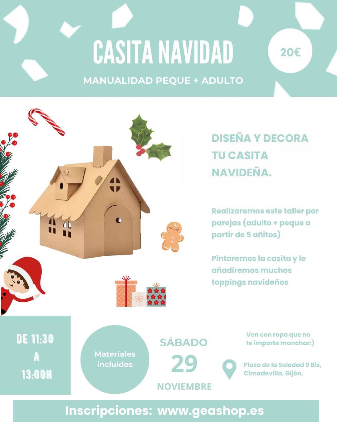 Diseñaremos nuestra casita navideña en 3D. El taller se realizará por parejas (peque+adulto) disfrutando de tiempo de calidad junt@s y sacando vuestro lado más creativo para pintar vuestra casita y añadir muchos toppings navideños que tendréis a vuestra disposición. Anímate a un plan diferente con el / la peque de la casa.